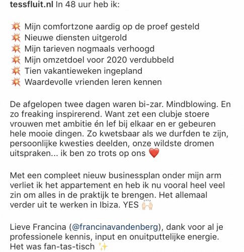 In twee dagen werden mijn doelen helder en ontpopte zich een realistisch plan om concreet mee aan de slag te gaan. Francina is ontzettend helder, weet waar ze het over heeft en geeft je een duw in de goede richting.