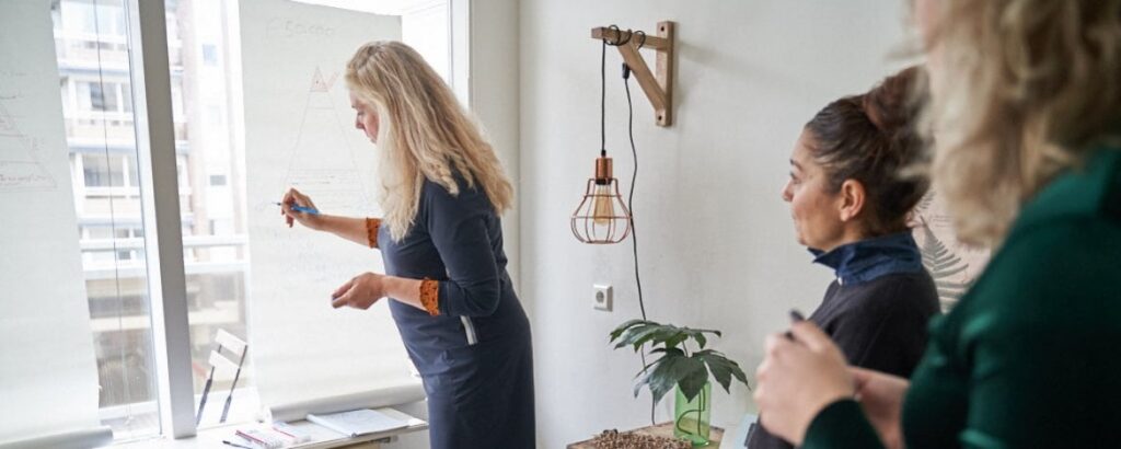 We hadden een strak schema, omdat ik graag wil dat we intensief met de strategie & planning aan de slag gaan. Ik wil dat de ondernemers creatief bezig zijn, daarom neem ik altijd papier mee om op de ramen te plakken. Zo is er geen laptop nodig en kan iedereen creatief aan de slag met pennen en kleurstiften. Na het voorstellen kwam de opdracht om na te gaan denken over de doelen die je wil gaan behalen in 2019. Dit mogen doelen zijn op zakelijk en business vlak, maar ook privé. Hieronder zijn de ondernemers bezig met het opschrijven van hun doelen.